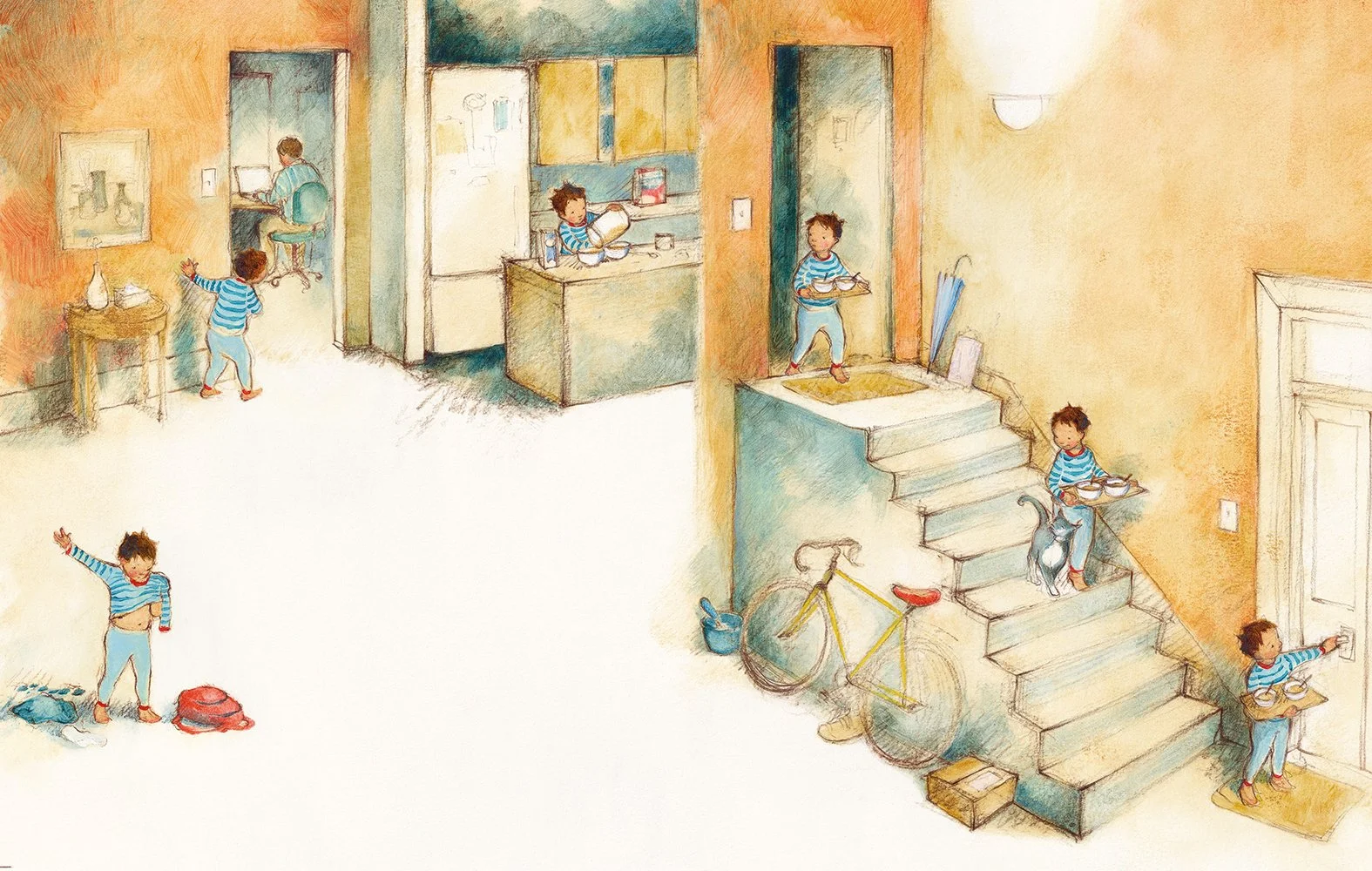 A boy seems to be alone and lonely. We see him getting ready and travelling to school and then by himself in the crowded playground. He has to be independent; his family is busy and doesn’t seem to have time for him. We discover during the course of the book that they have a new baby.